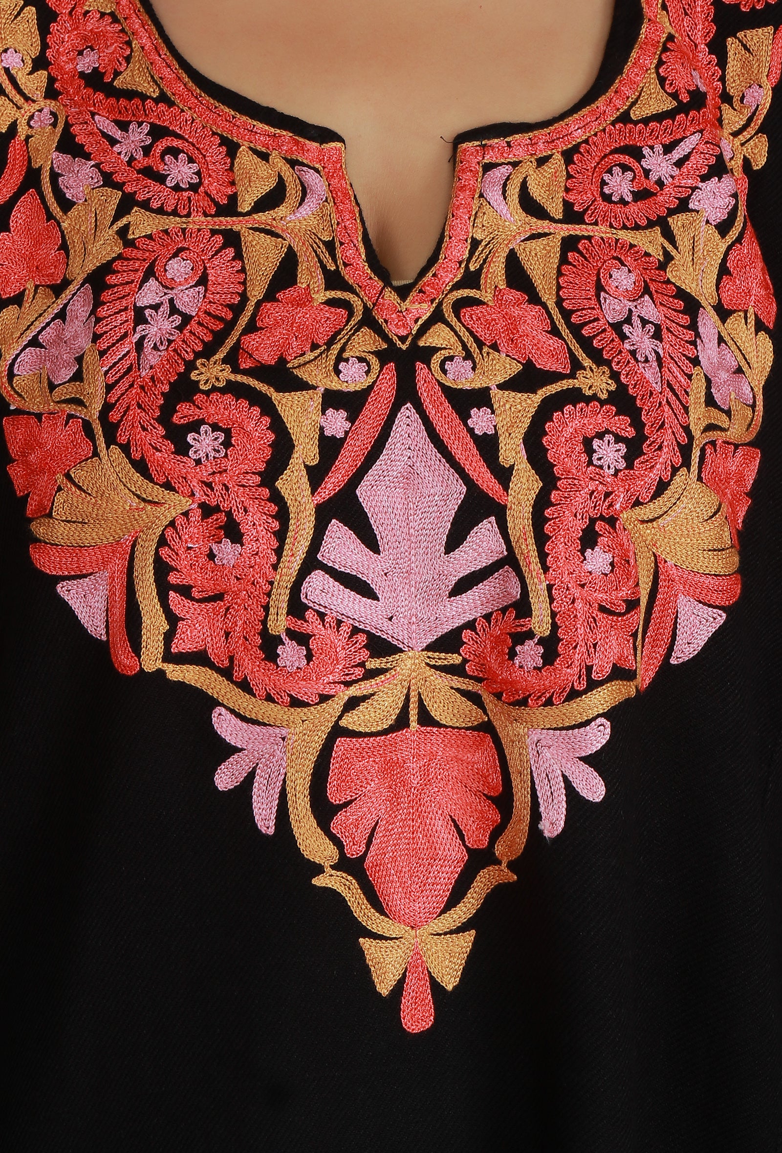 Elegant Black Kashmiri Phiran adorned with intricate Aari chain-stitch embroidery in dual-tone floral and vine motifs. Made from a warm wool/Cashmilon blend, this traditional long garment features a beautifully detailed notched neckline and is perfect for stylish, cozy winter wear.
