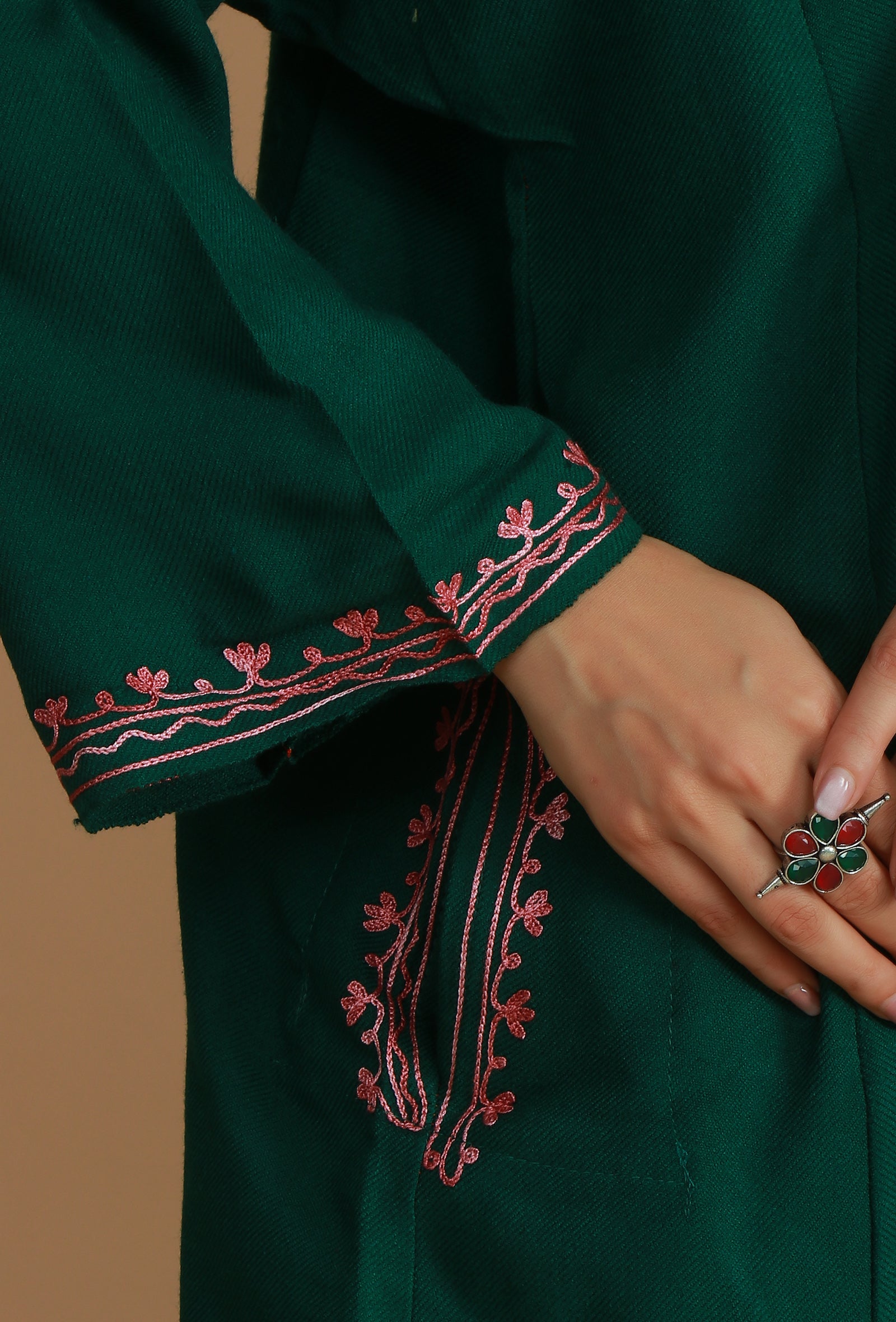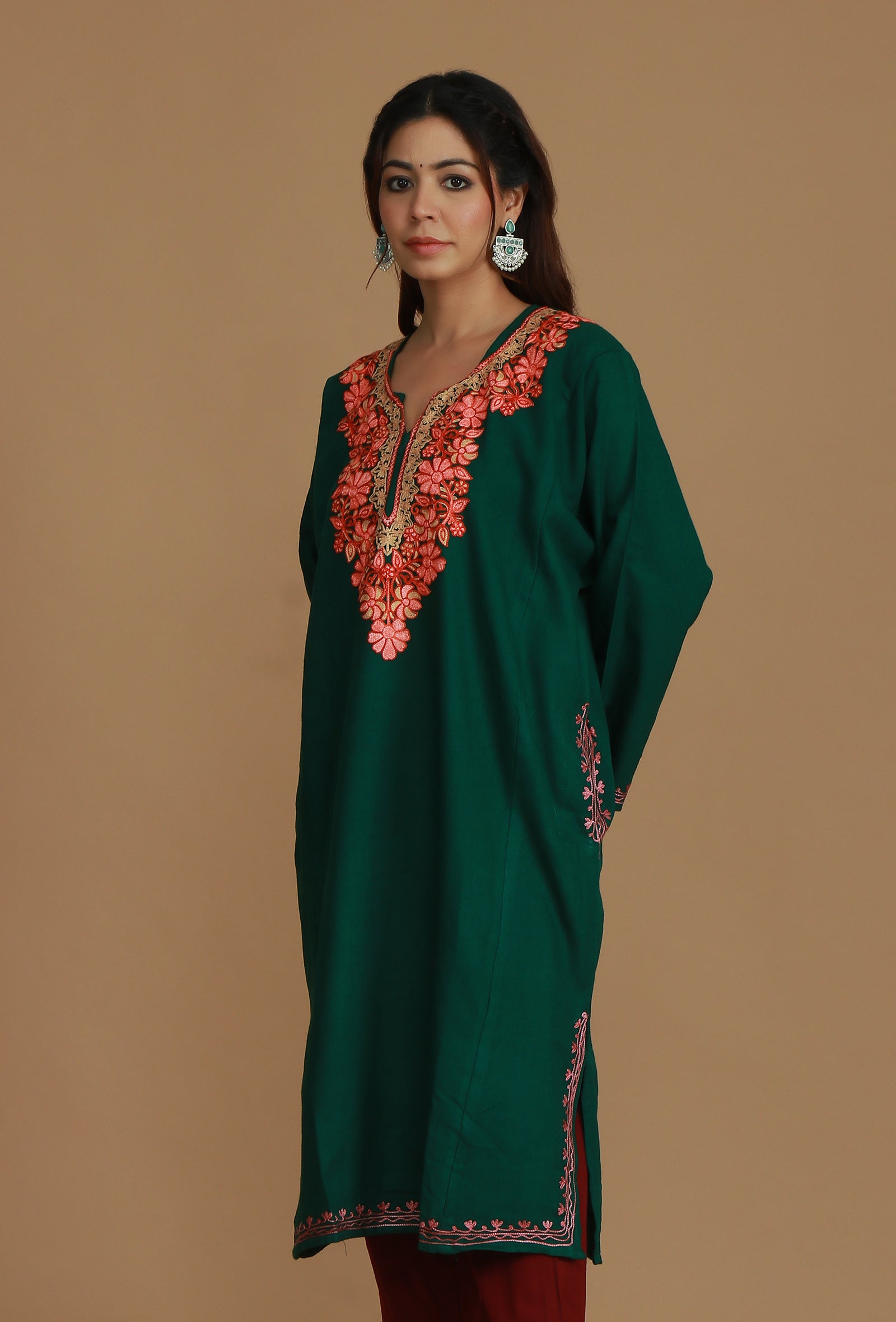 This warm Forest Green phiran is crafted from a soft wool blend, featuring vibrant Aari embroidery in peach and coral floral motifs. The dense, striking design dominates the V-neckline, providing a rich, festive, and comfortable look.