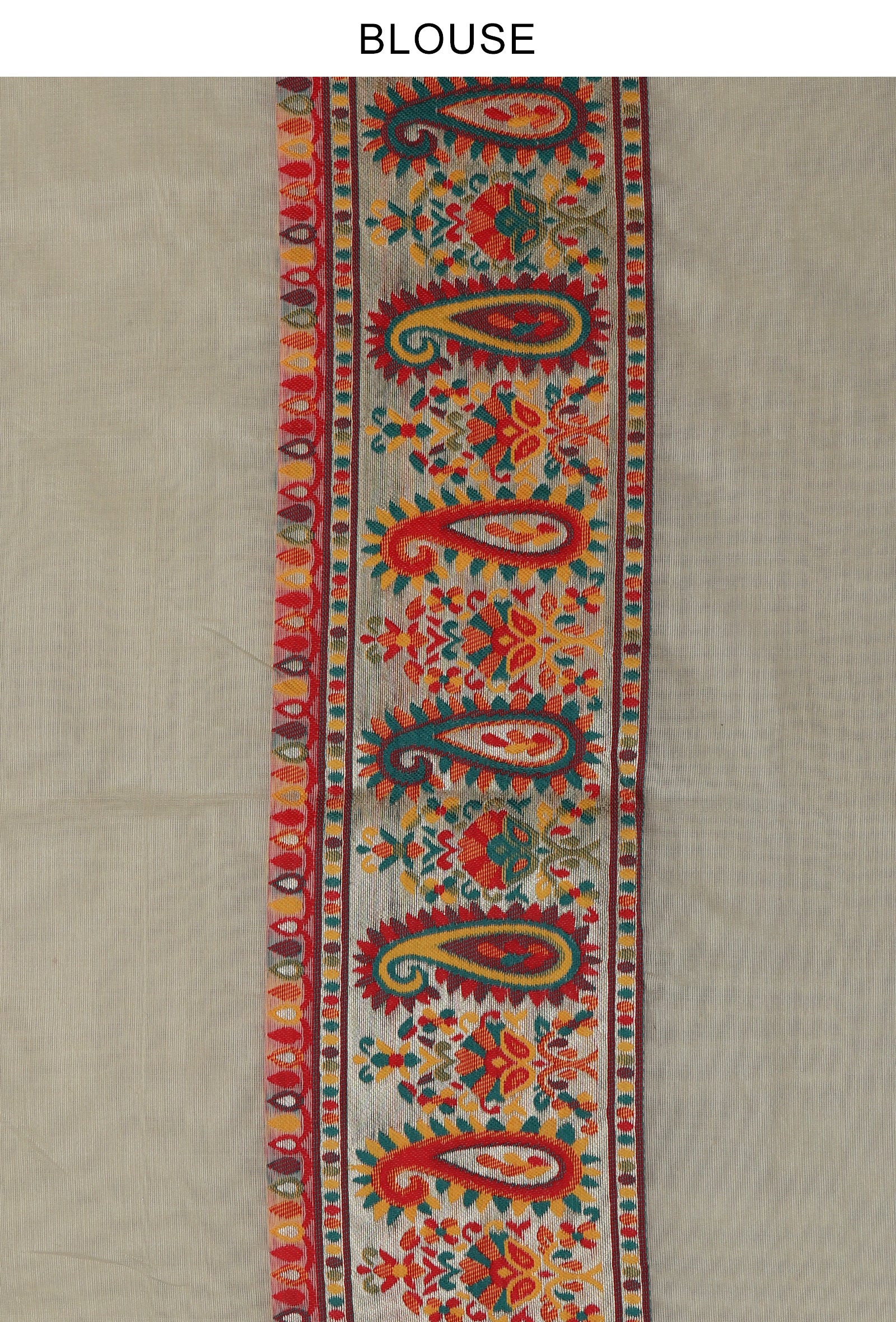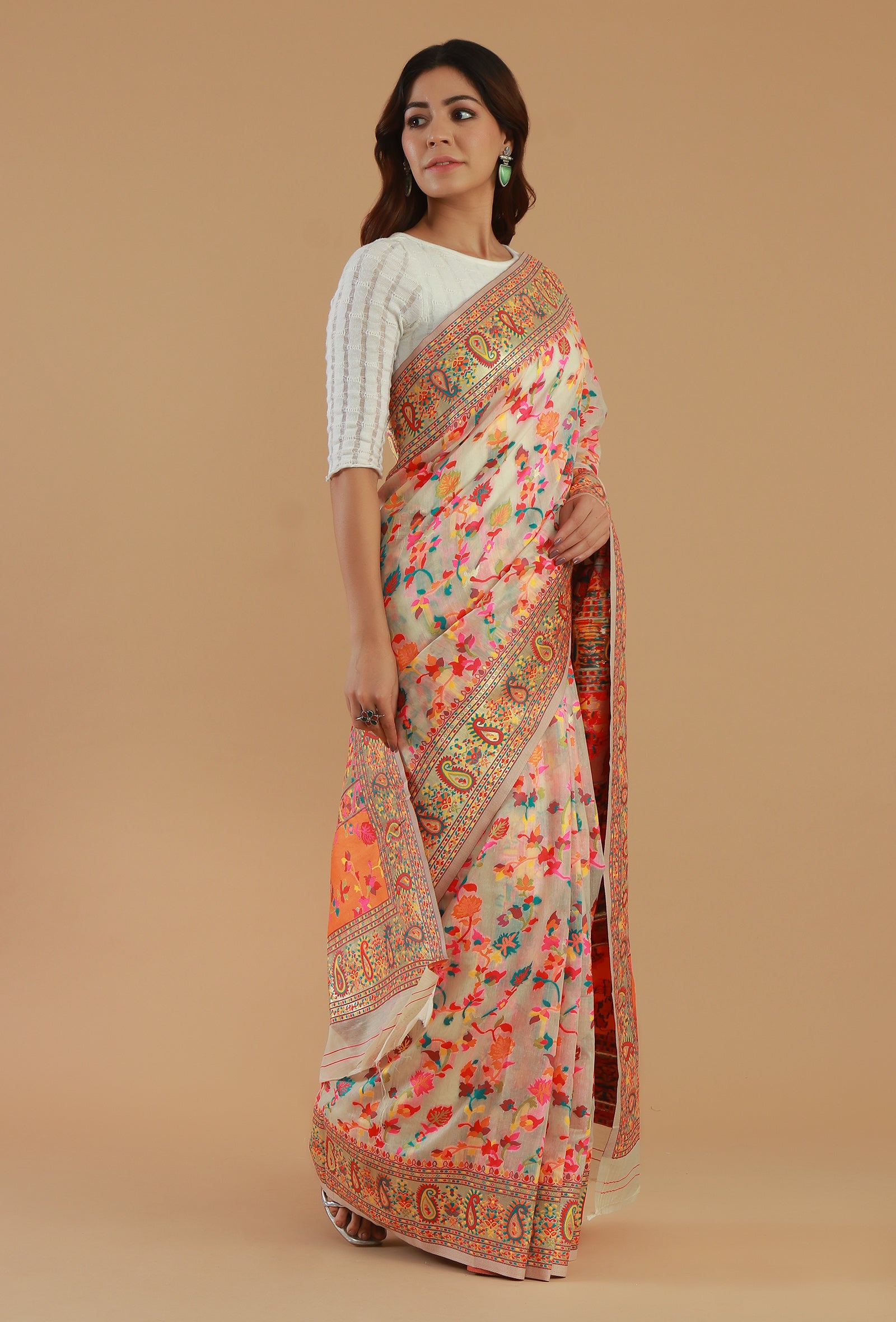 This elegant ivory saree is adorned with vibrant multicolor floral motifs and finished with a rich traditional border and statement pallu, inspired by heritage Kashmiri artistry. Its soft, fluid drape offers a luxurious, festive-ready look perfect for weddings, celebrations, and evening occasions. Pair it with classic jewelry for a timeless and graceful appeal.