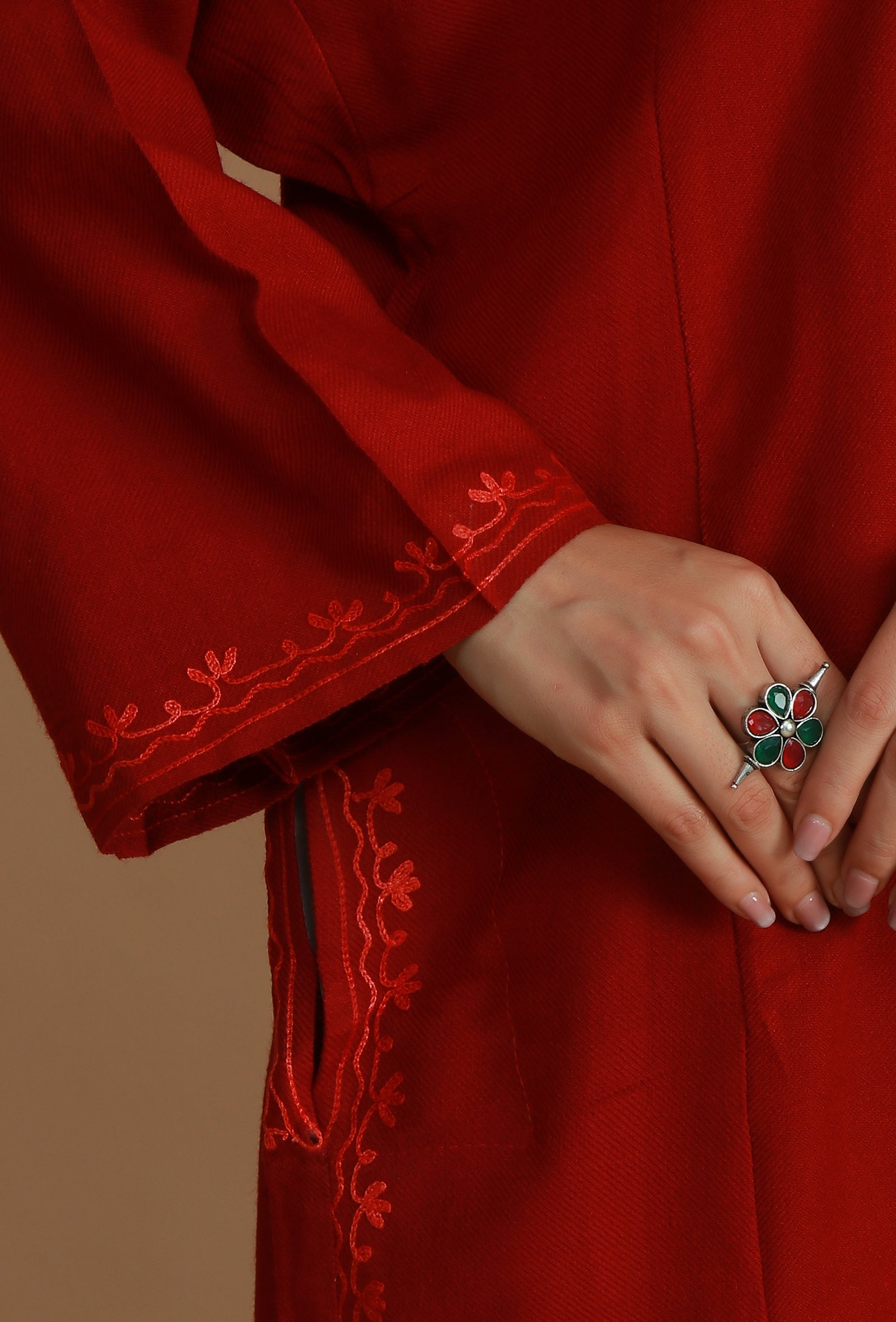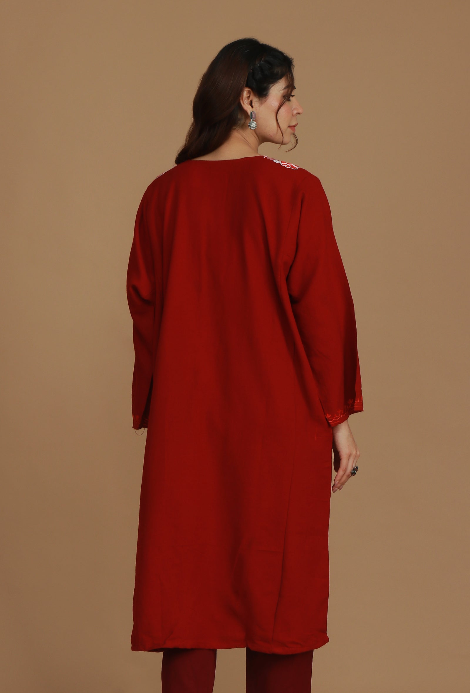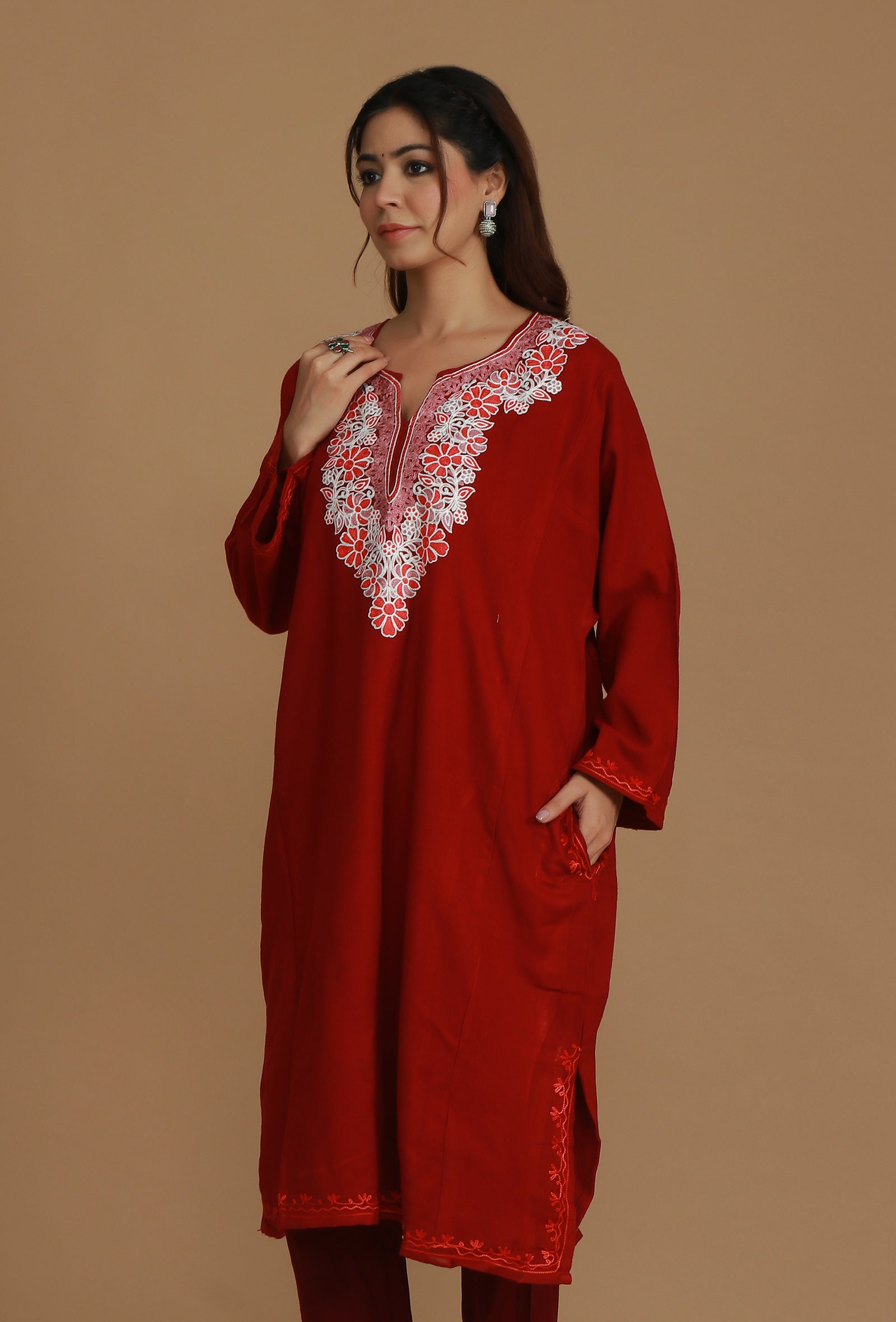 This warm Maroon phiran is crafted from a soft wool blend, featuring vibrant Aari embroidery in white and pink floral motifs. The dense, striking design dominates the V-neckline, providing both comfort and a bold traditional aesthetic.