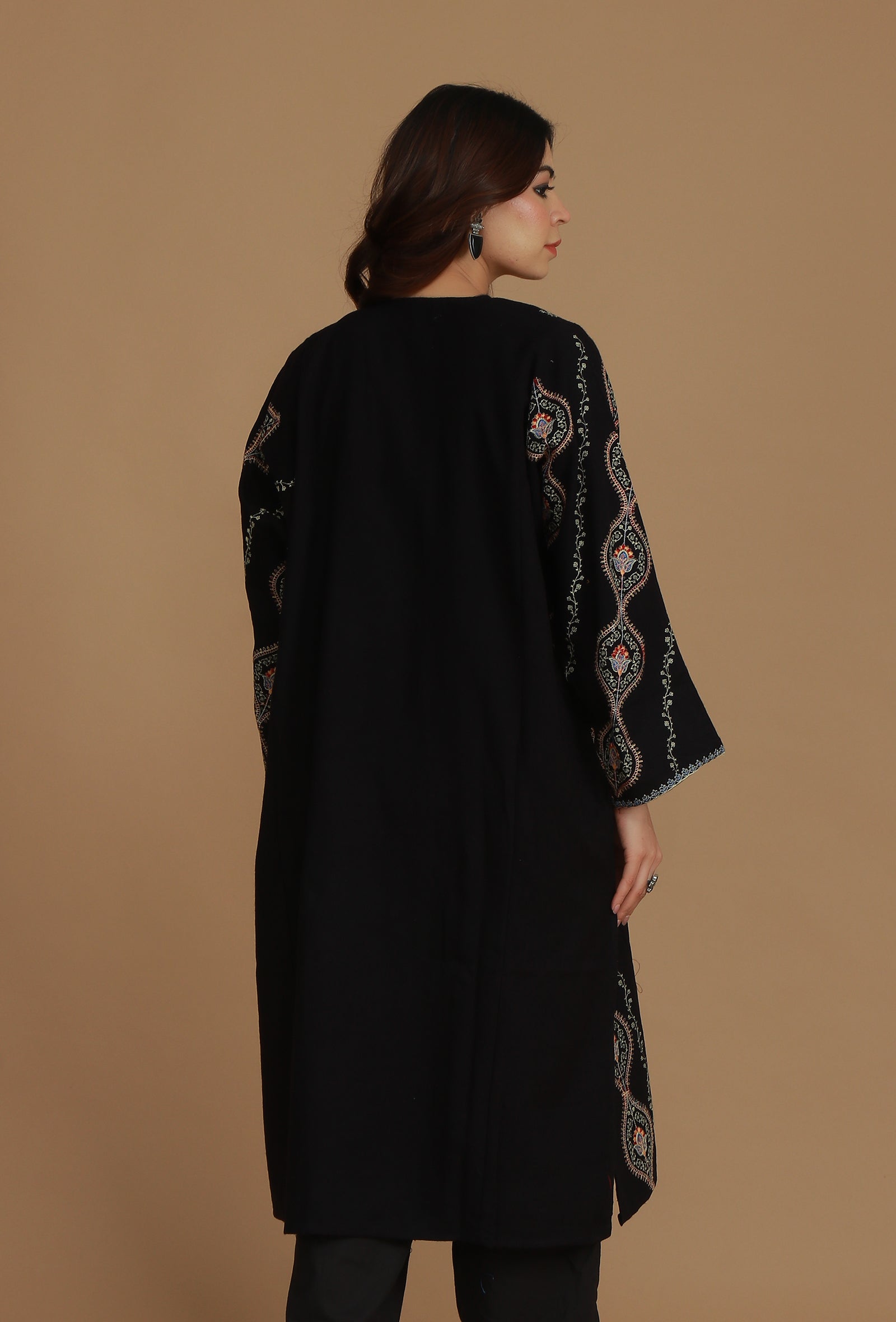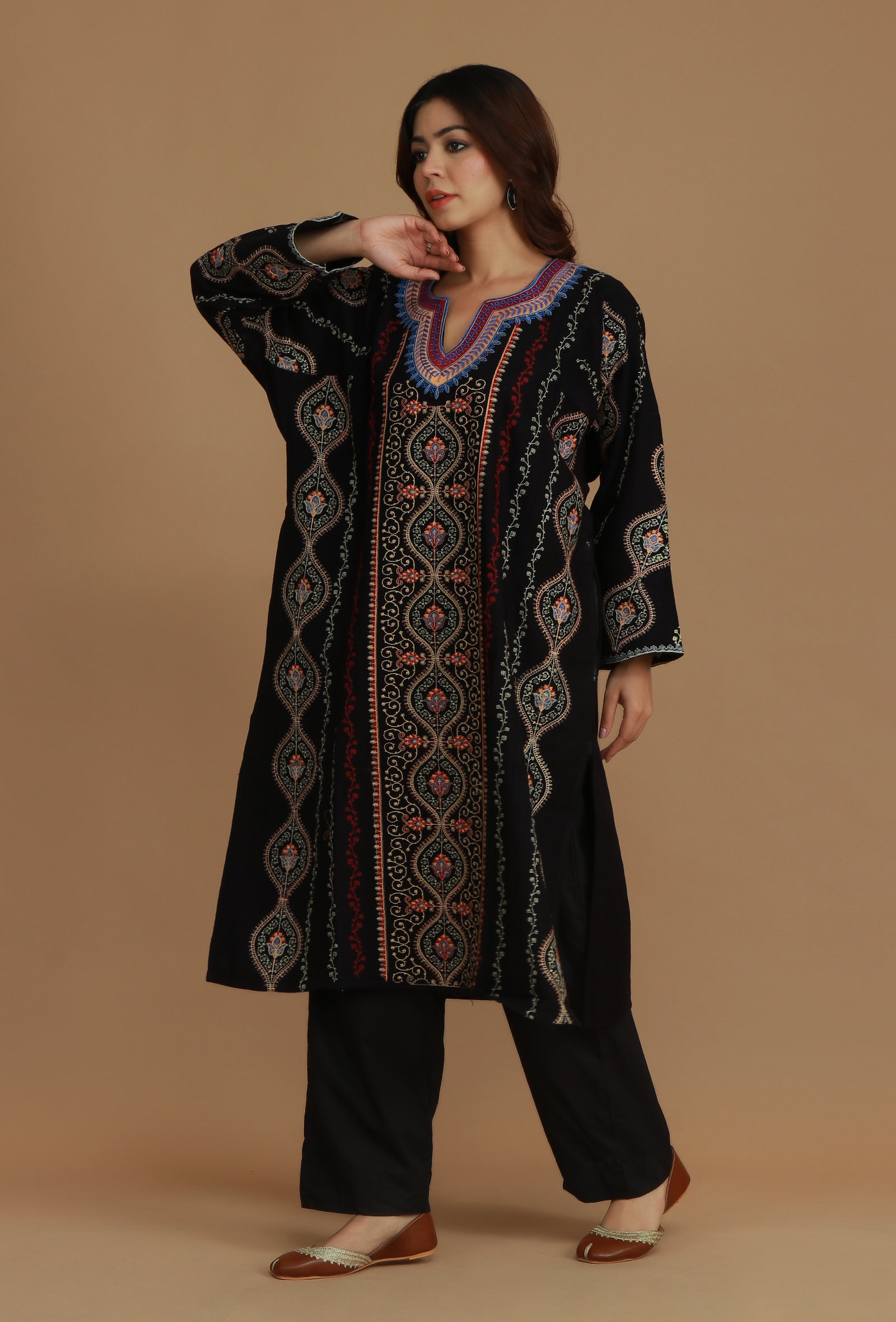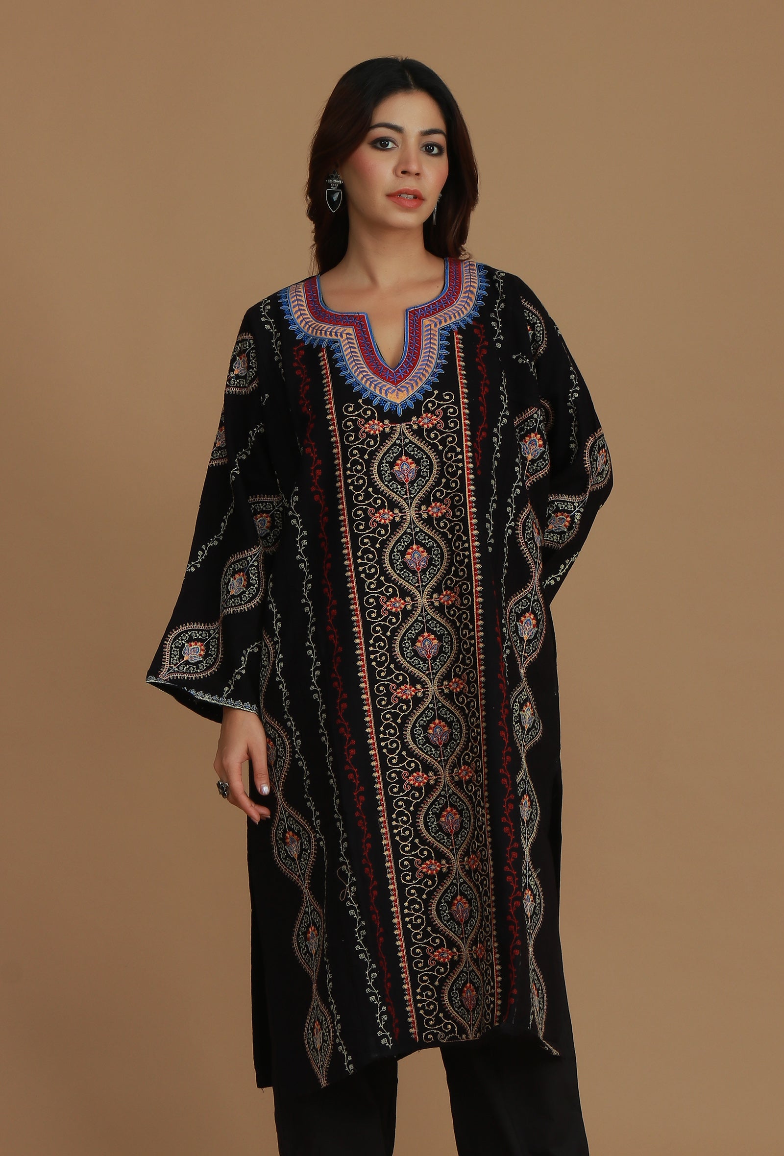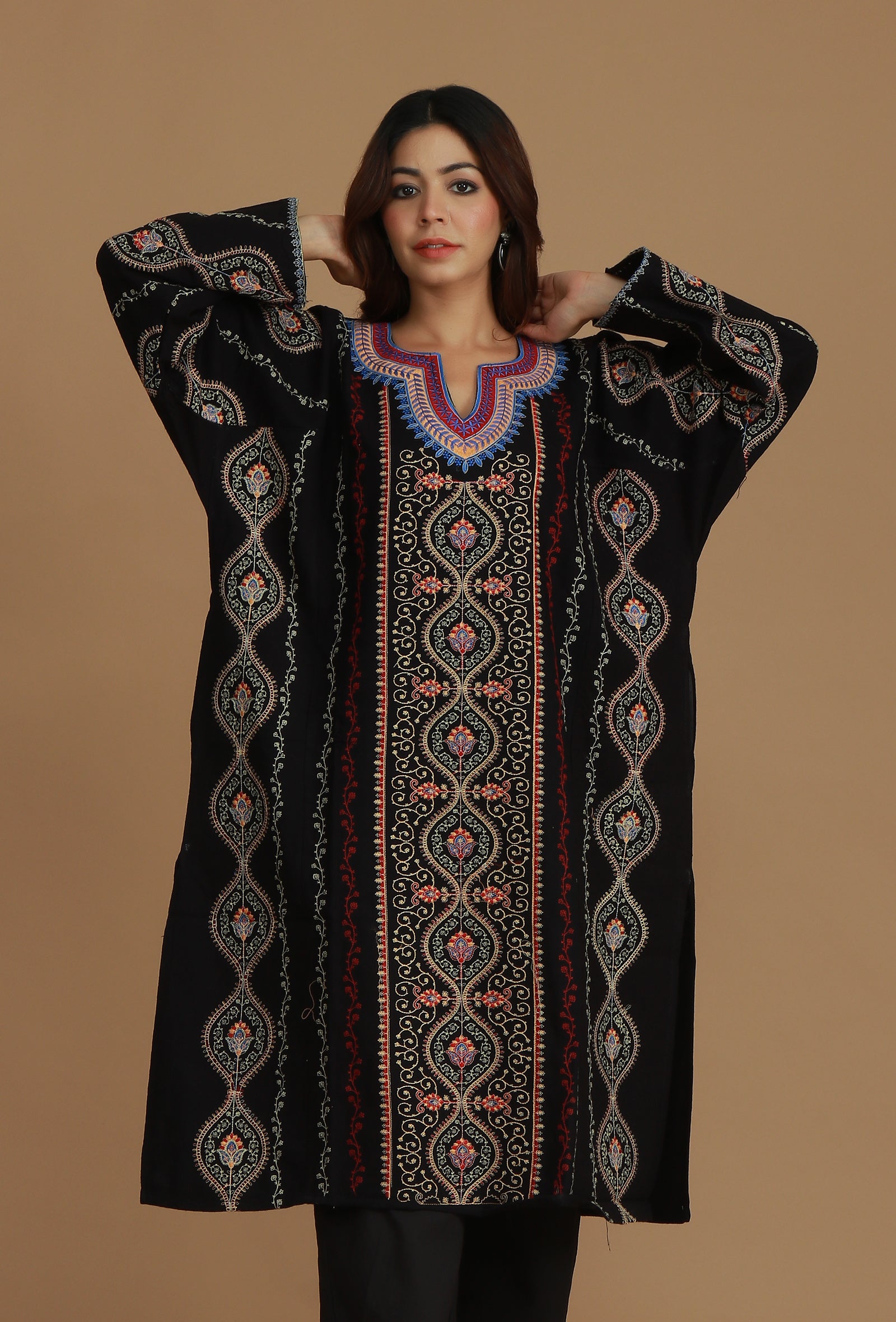 Embrace timeless Kashmiri elegance with this exquisite black free-size phiran, adorned with intricate multicolour embroidery in traditional motifs. The beautifully detailed threadwork along the neckline, front, and sleeves showcases rich craftsmanship, while the relaxed silhouette offers effortless comfort and warmth. Perfect for festive occasions or winter gatherings, this phiran blends heritage charm with contemporary style.