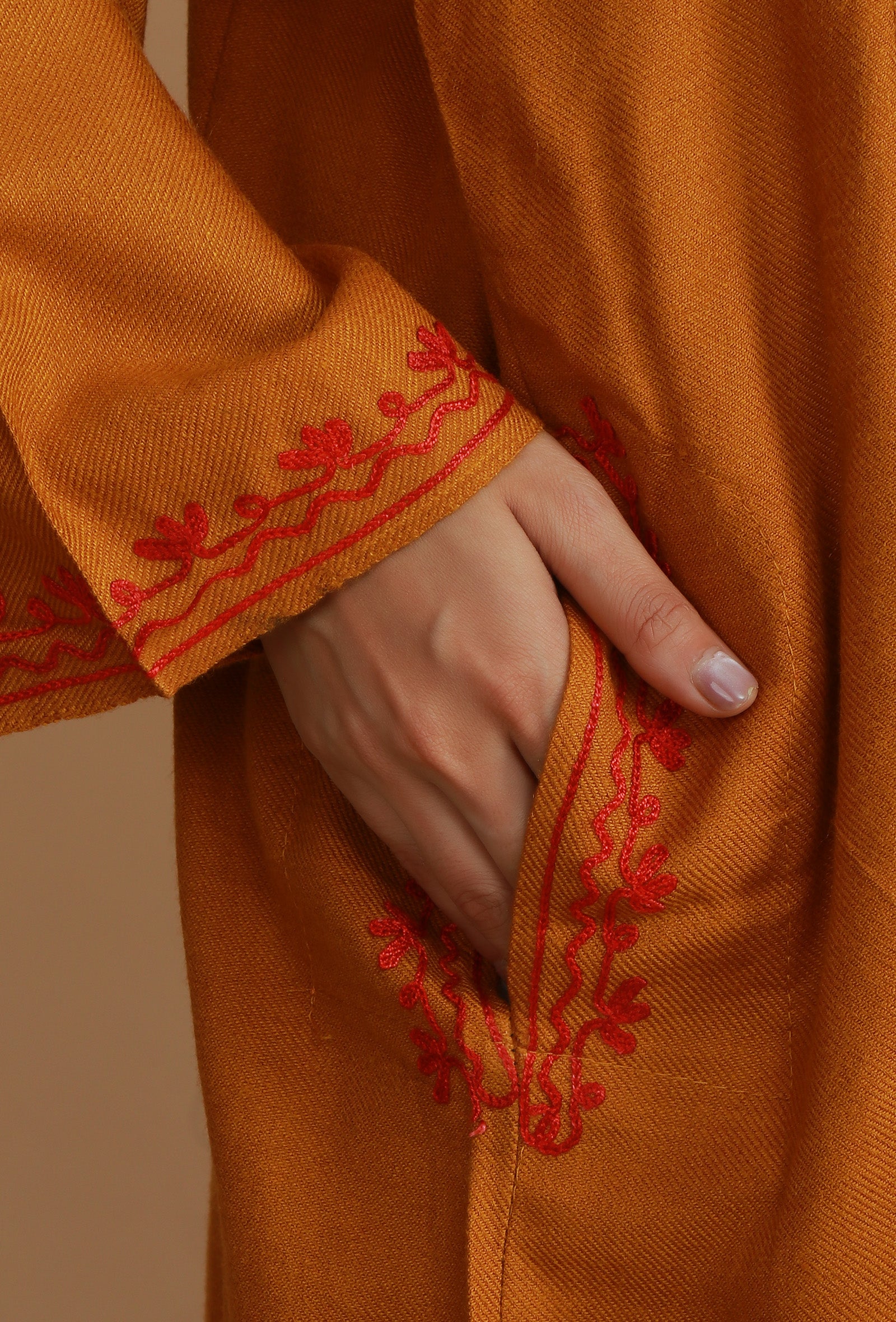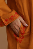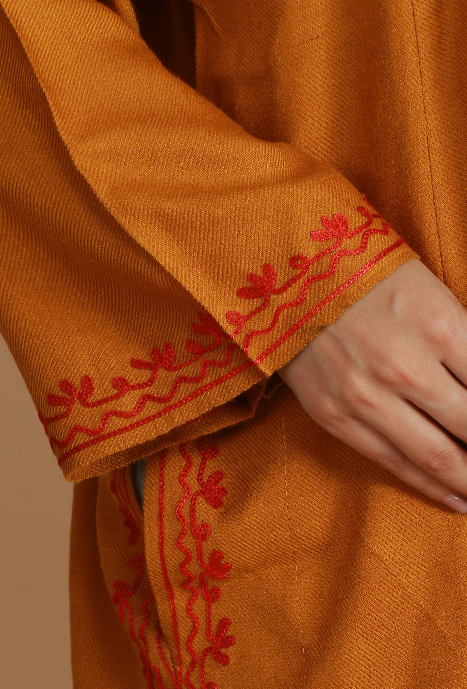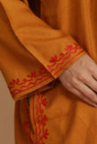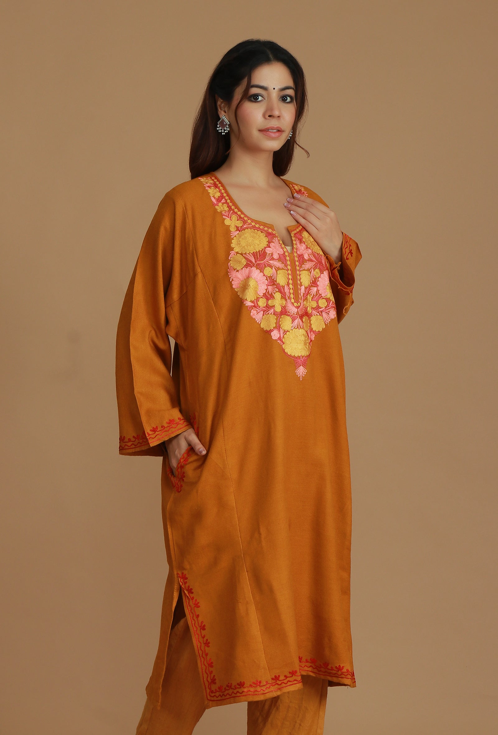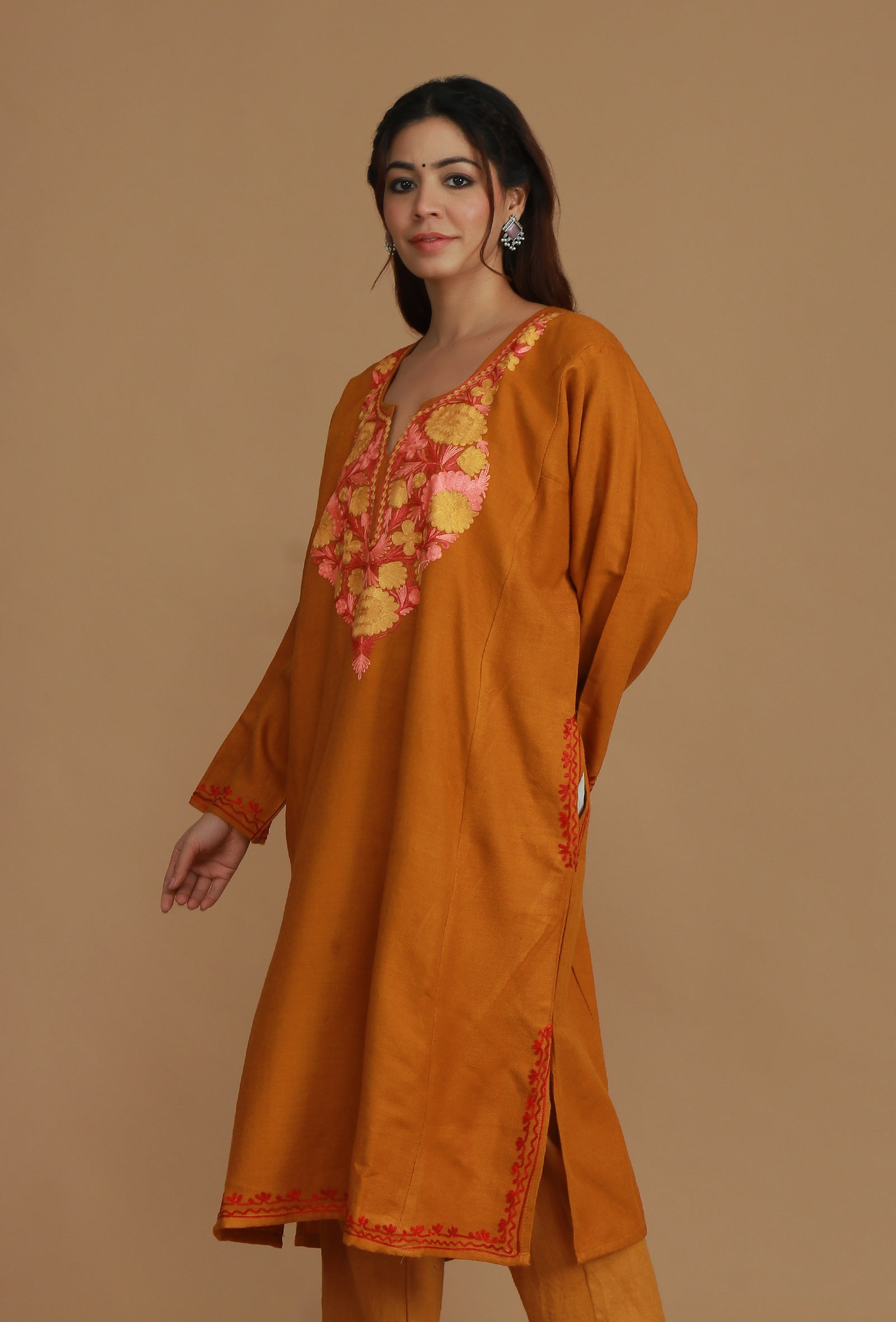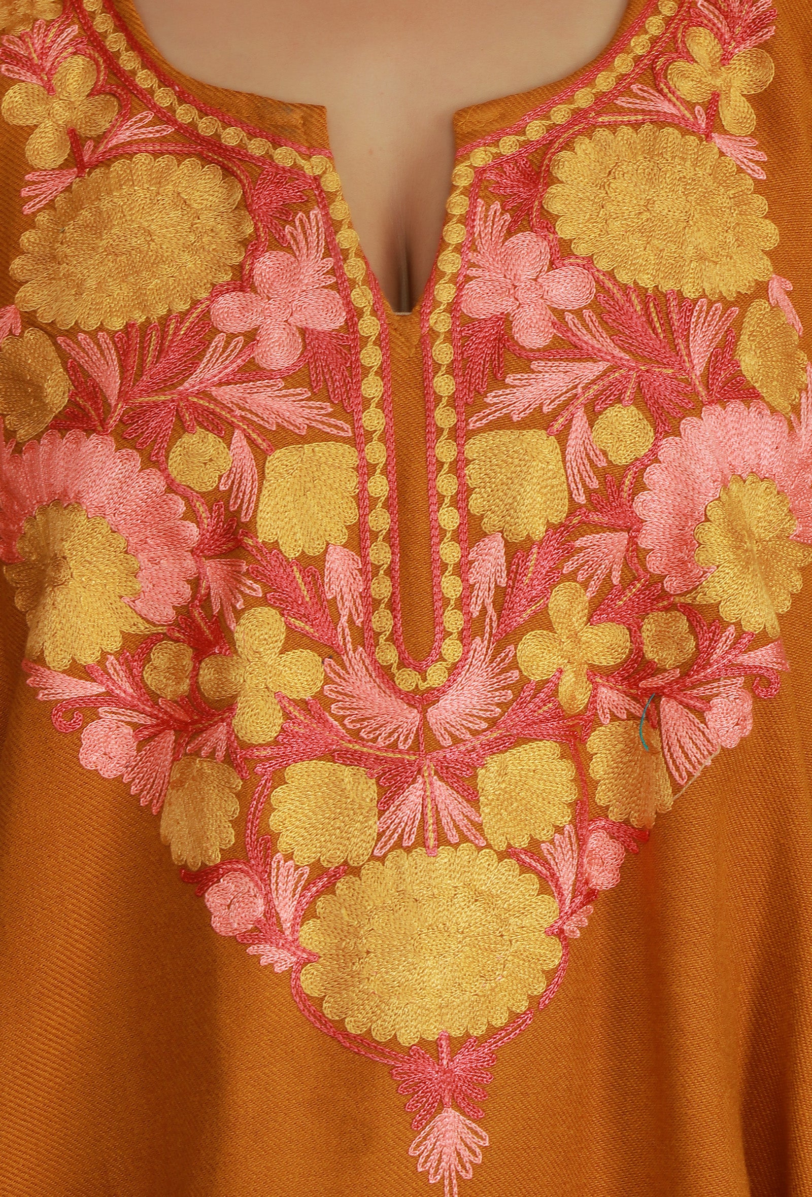 This warm Mustard Yellow phiran is crafted from a soft wool blend, featuring vibrant Aari embroidery in yellow and bright pink floral motifs. The bold design dominates the V-neckline, providing both comfort and a rich, traditional aesthetic.