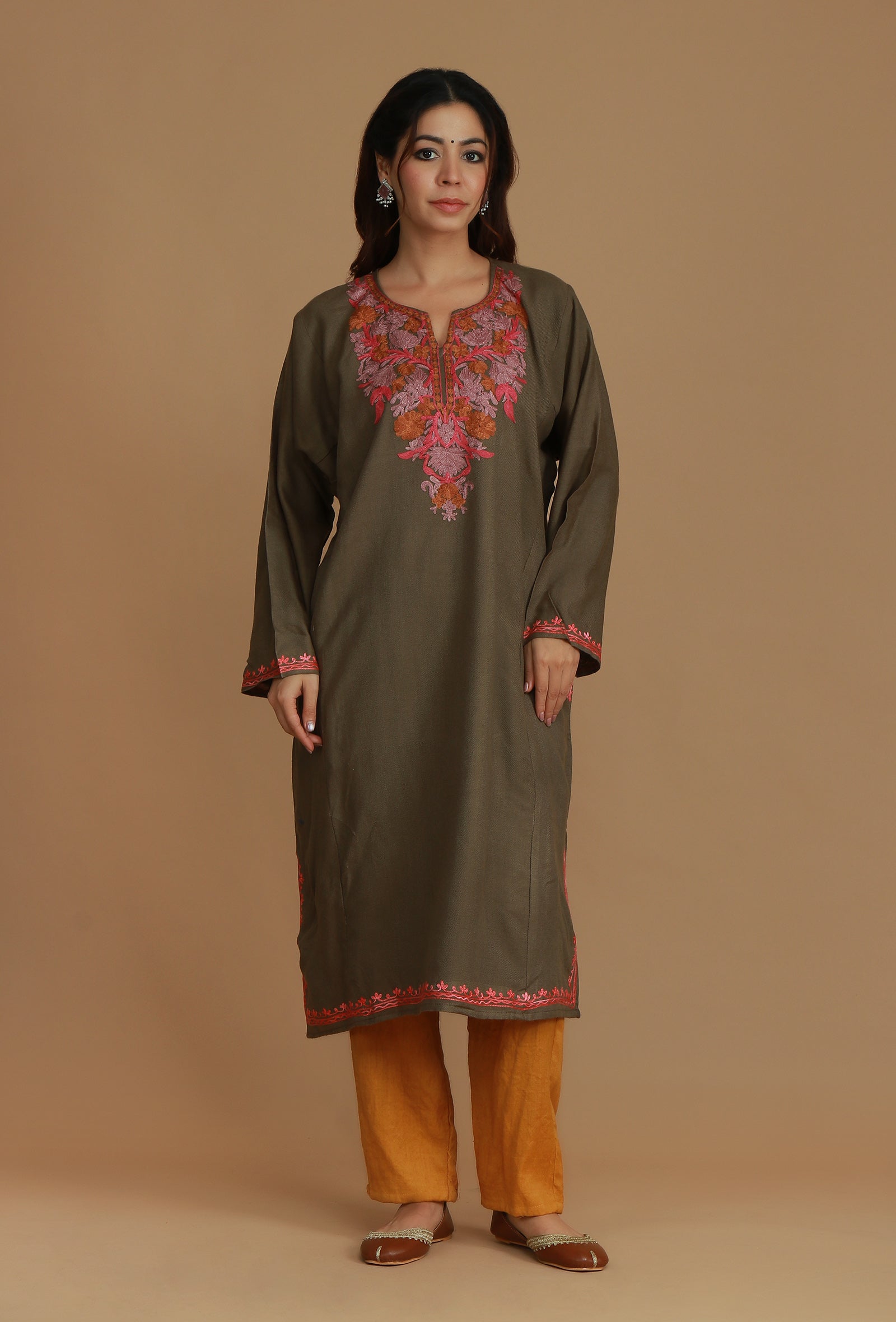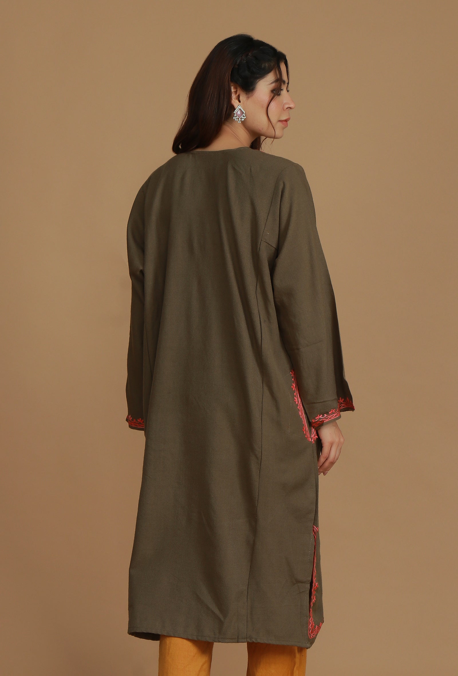 This warm Olive Brown phiran is crafted from a soft wool blend, featuring vibrant Aari embroidery in pink, coral, and maroon floral motifs. The intricate design dominates the V-neckline, providing a rich, comfortable traditional aesthetic.