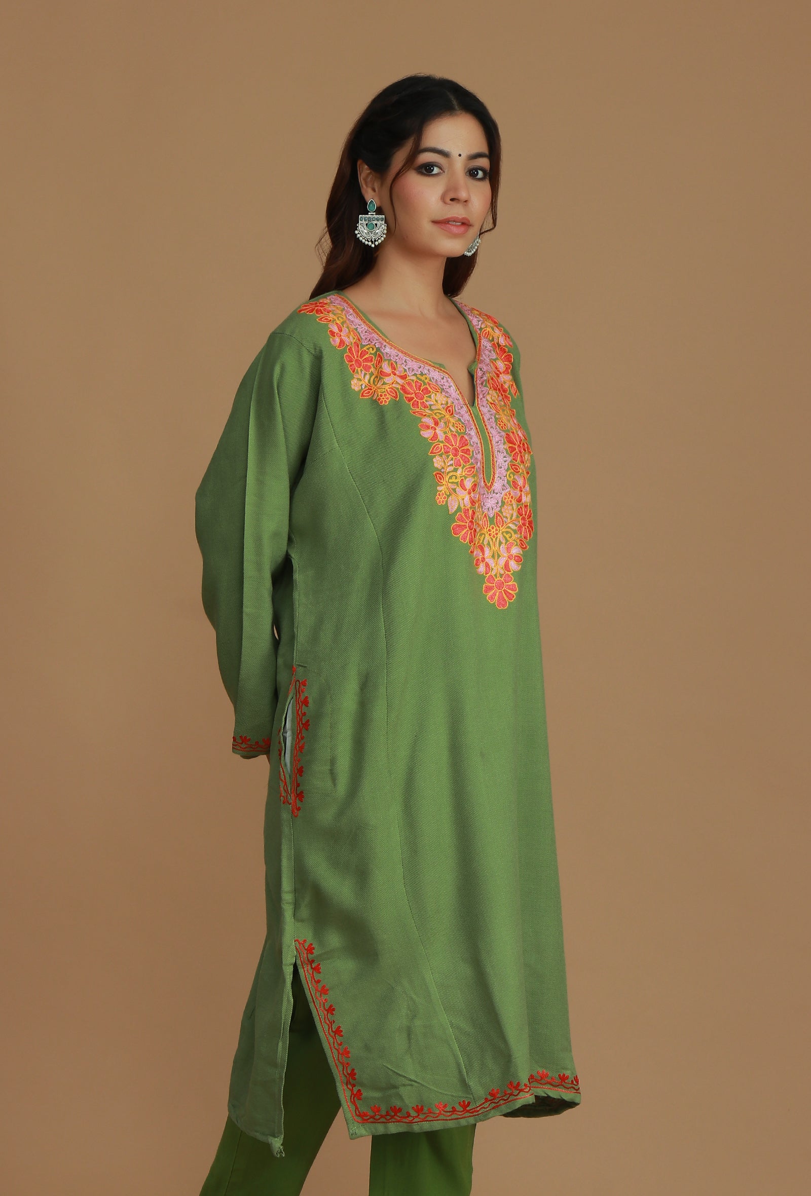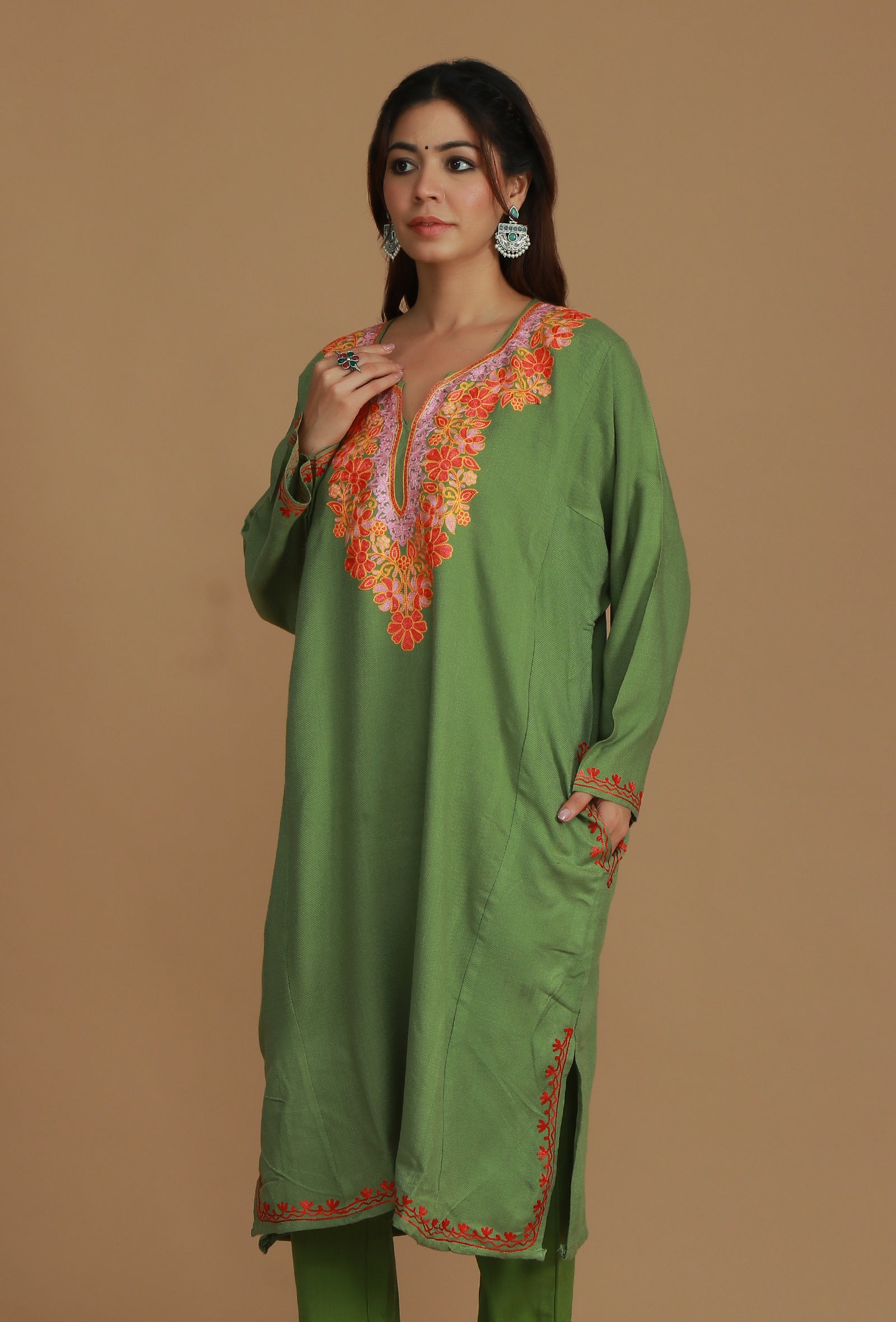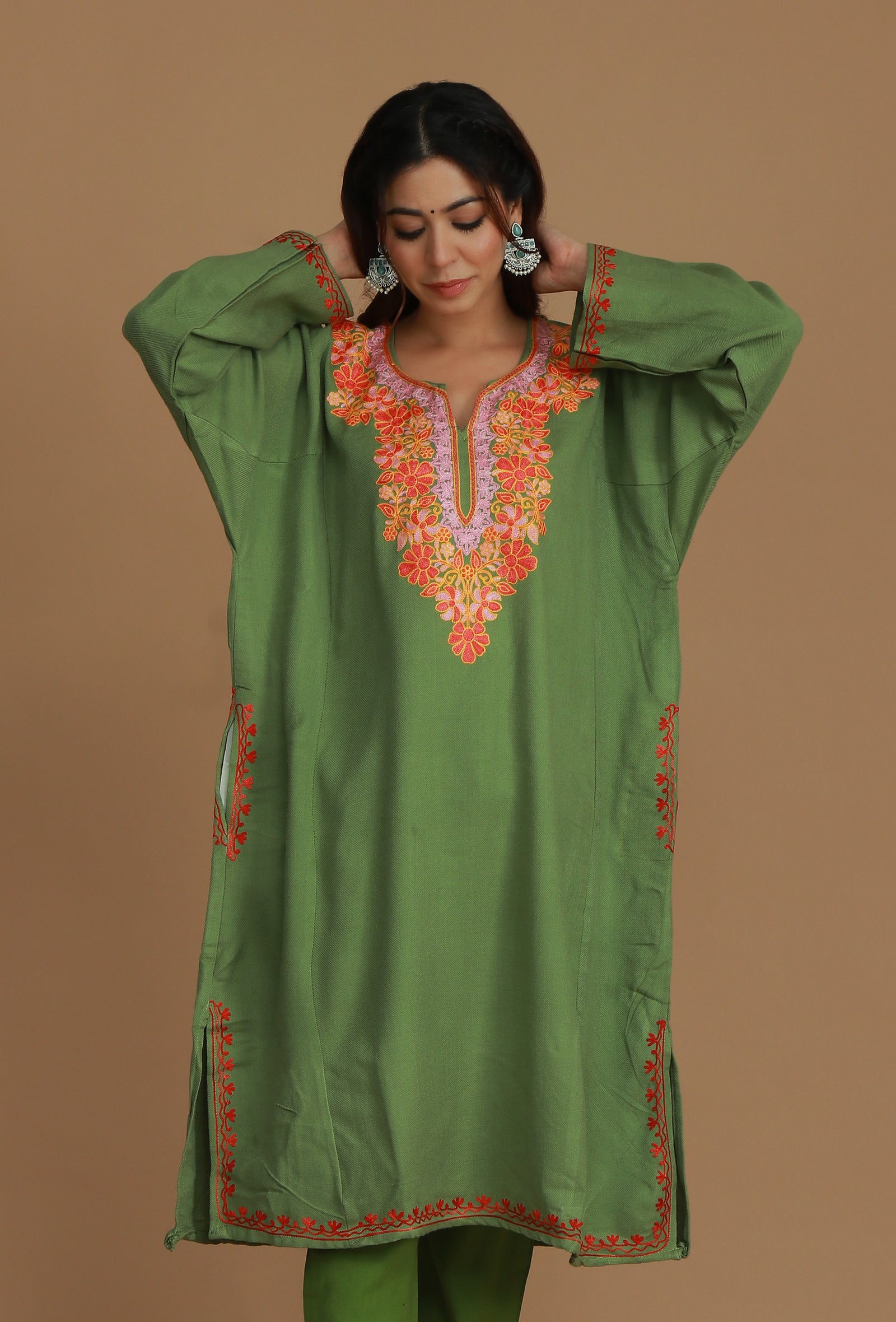 This warm Olive Green phiran is crafted from a soft wool blend, featuring vibrant Aari embroidery in pink, orange, and coral floral motifs. The bold, intricate design dominates the V-neckline, providing a comfortable and festive traditional look.