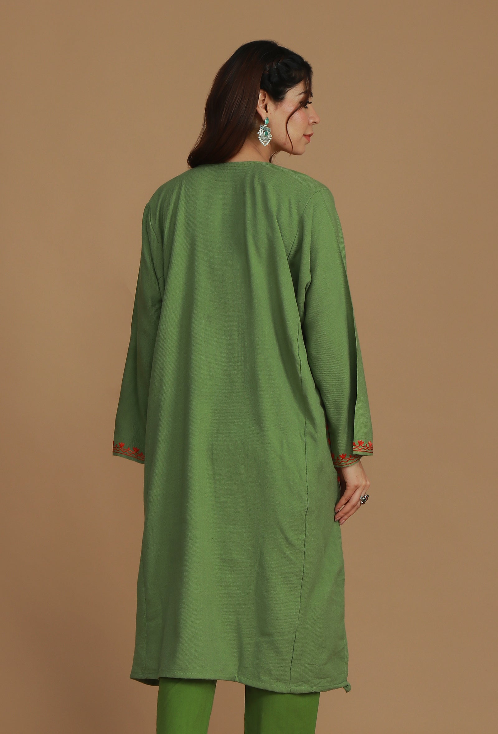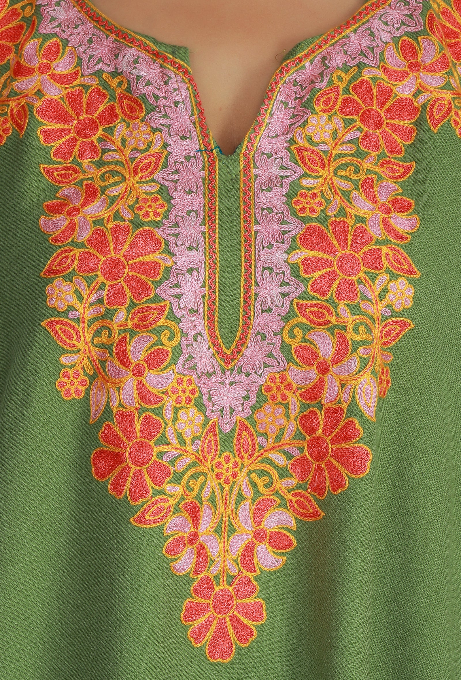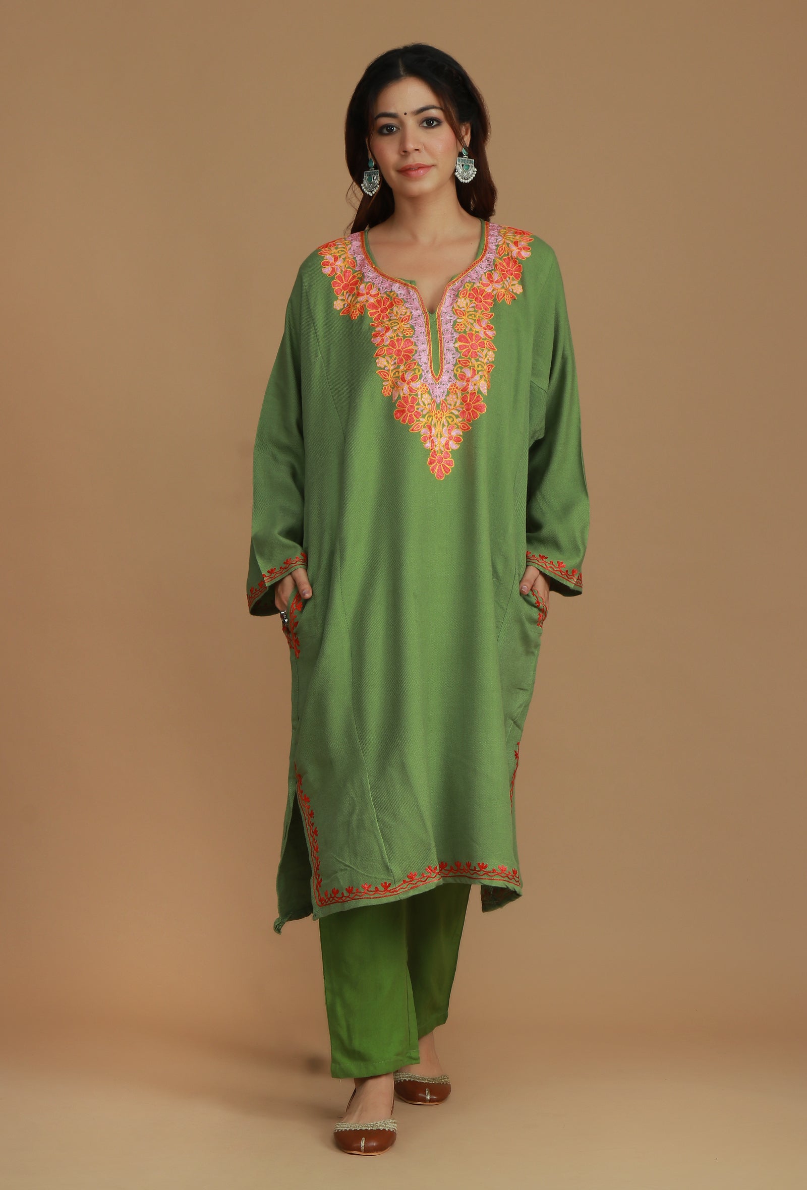 This warm Olive Green phiran is crafted from a soft wool blend, featuring vibrant Aari embroidery in pink, orange, and coral floral motifs. The bold, intricate design dominates the V-neckline, providing a comfortable and festive traditional look.