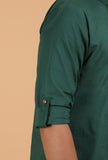 Grace any casual event with this elegant pine green plain shirt. Made with sustainable cotton, it has a mandarin collar, roll-up sleeves and half button placket. The wooden buttons enhance the style of this piece. Team it up with a pair or pants or trousers to complement the look.