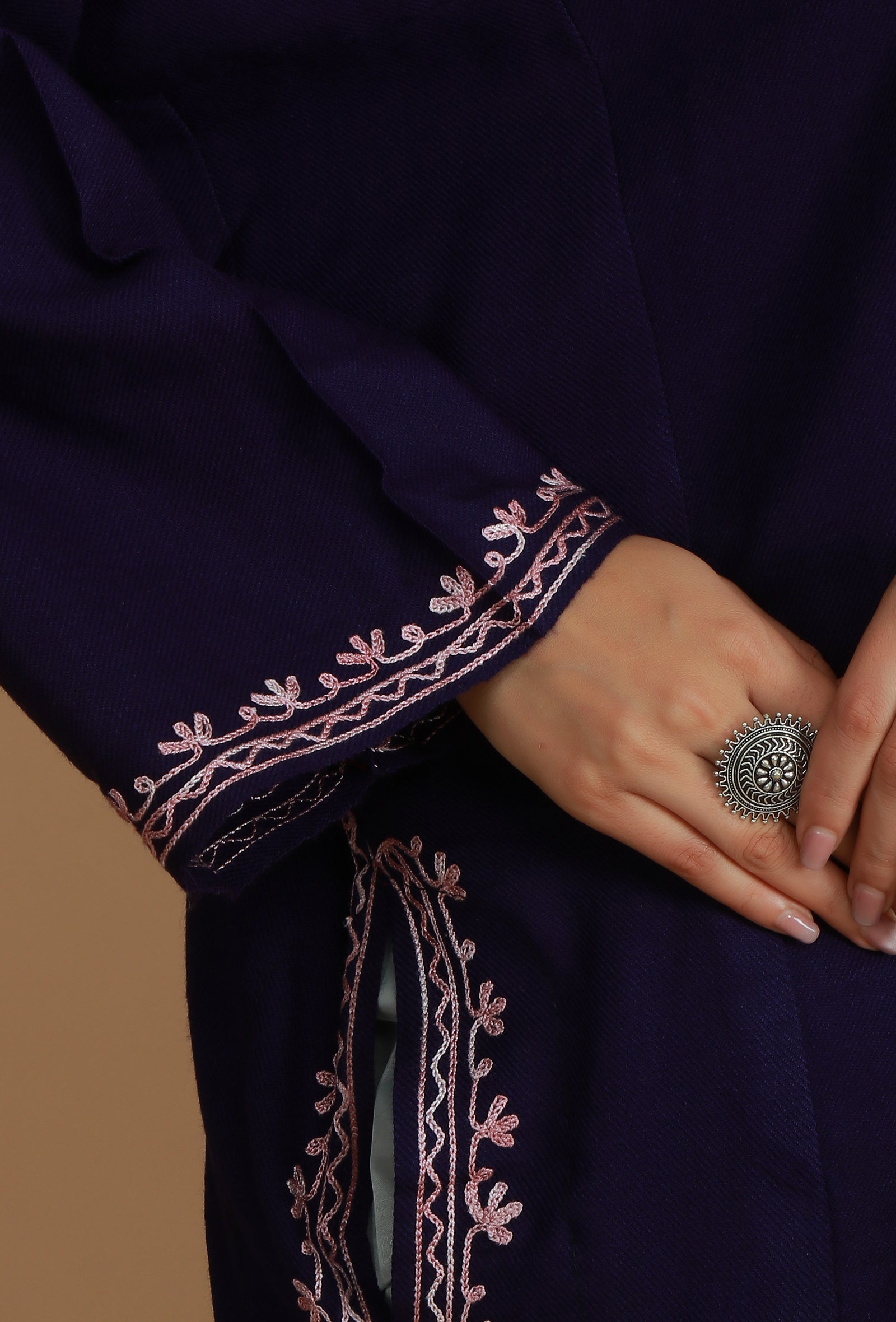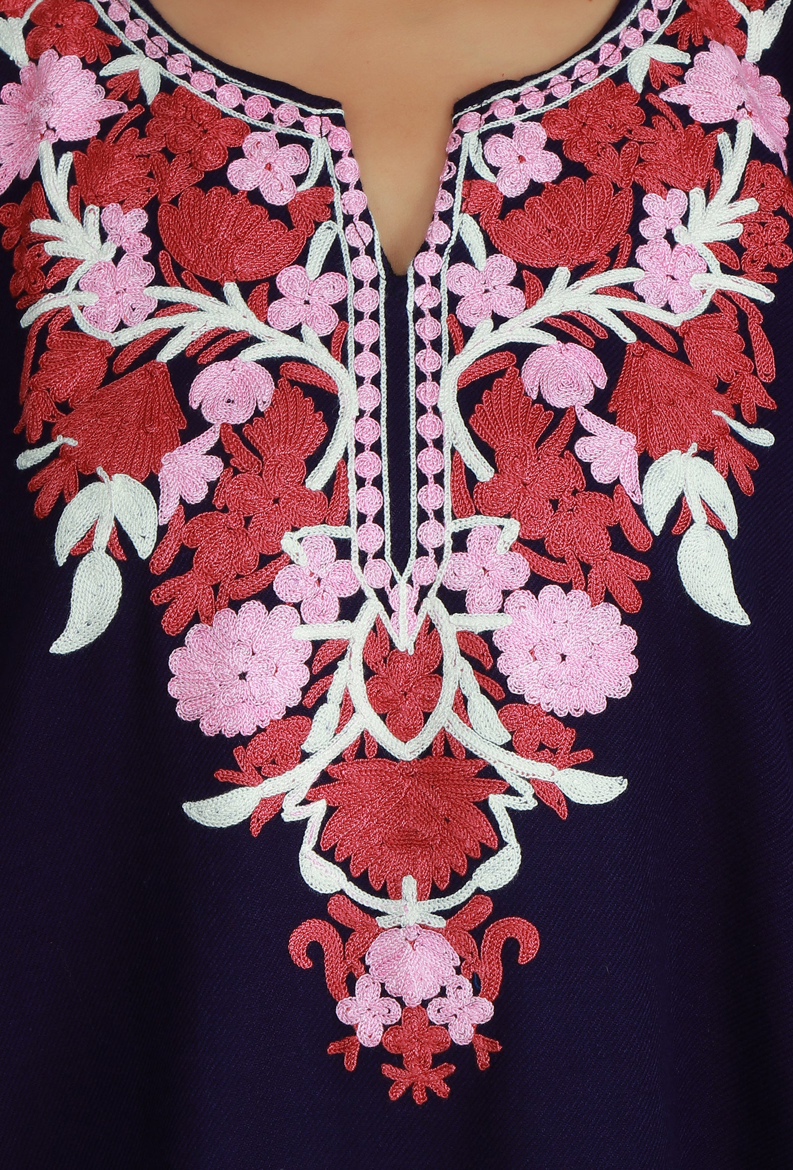 This traditional plum-colored phiran is crafted in a warm wool blend, adorned with ornate Aari embroidery in shades of pink and maroon. The large floral design dominates the V-neckline, providing both comfort and a rich aesthetic.