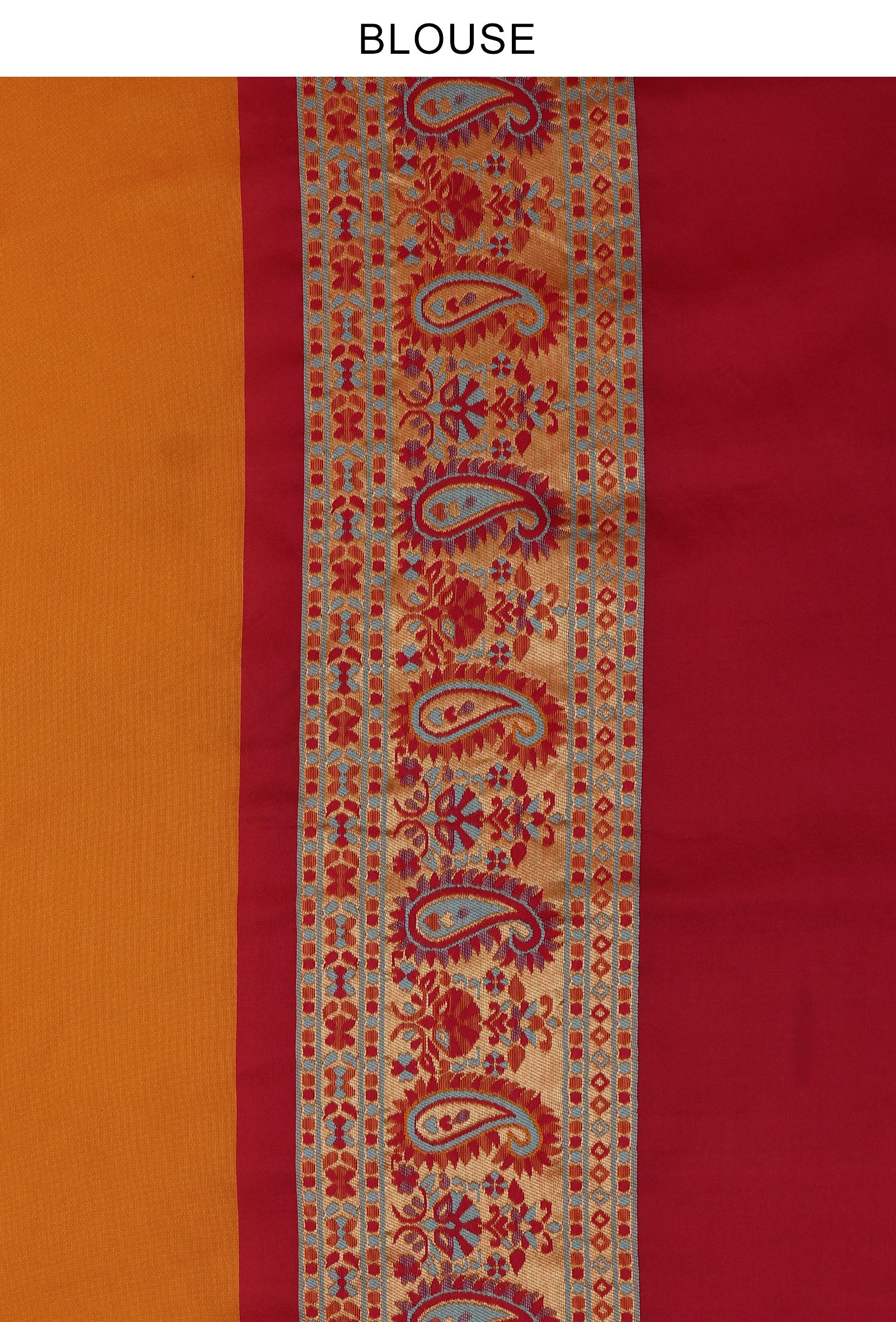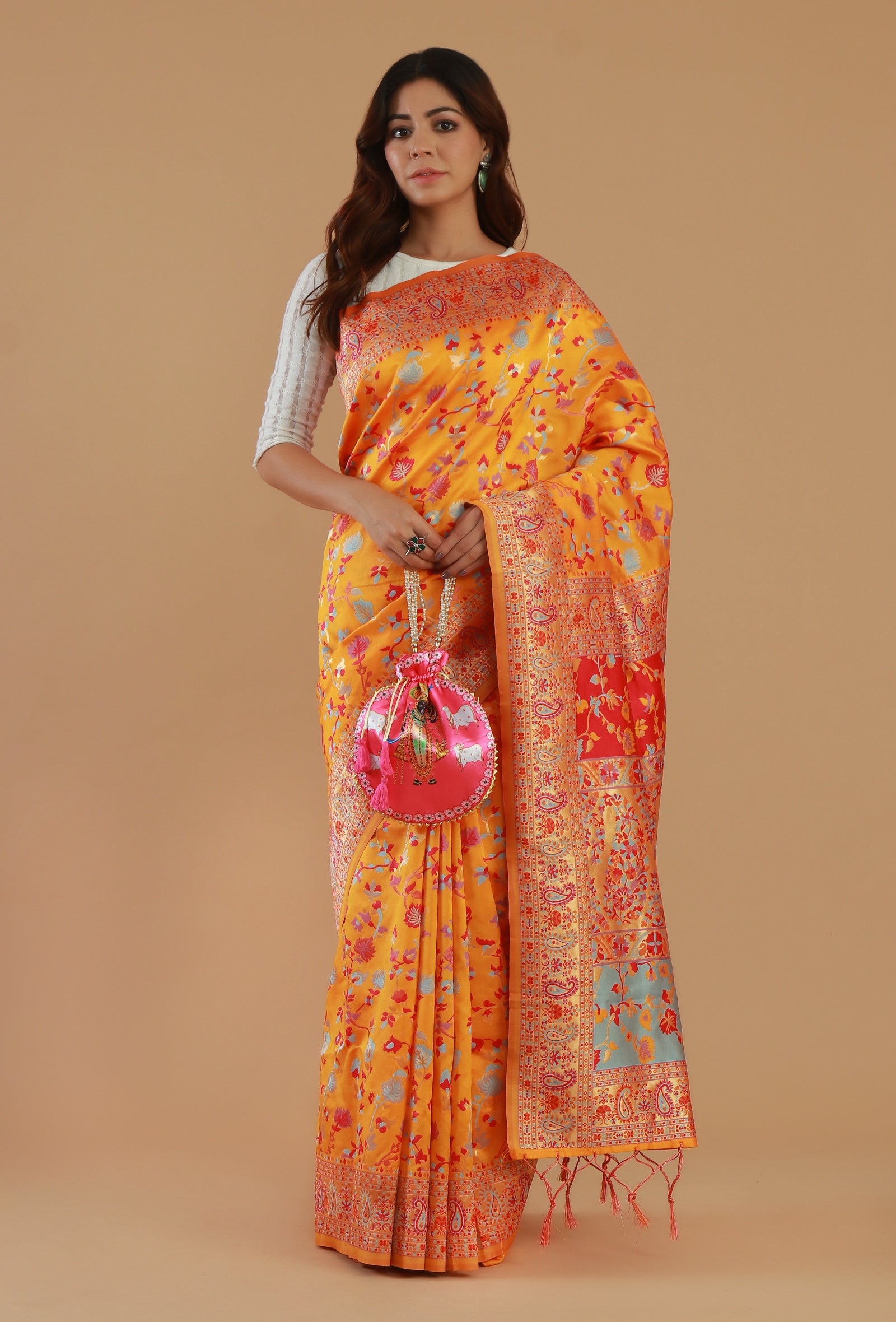 This vibrant yellow saree showcases exquisite multicolor floral motifs with a luxurious Kashmiri-inspired red and gold bordered pallu. Crafted in a smooth silk-touch fabric, it drapes effortlessly, offering a festive, radiant, and royal look perfect for weddings, haldi ceremonies, and grand celebrations.